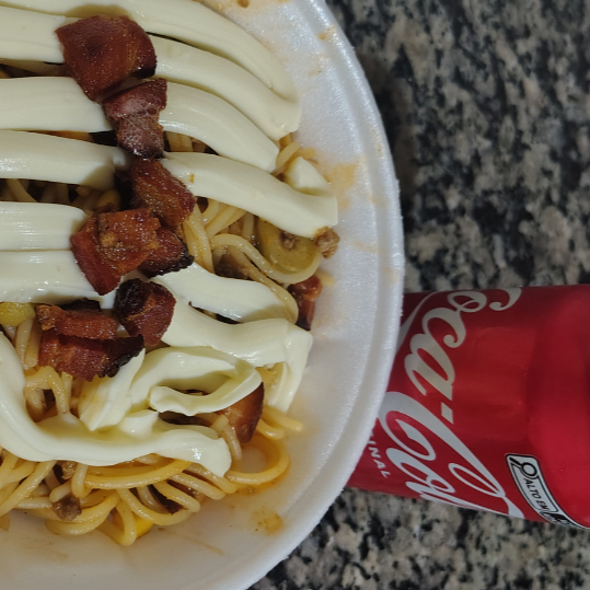Macarrão espaguete, molho bolonhesa, milho, azeitona, cheiro verde e coca cola lata