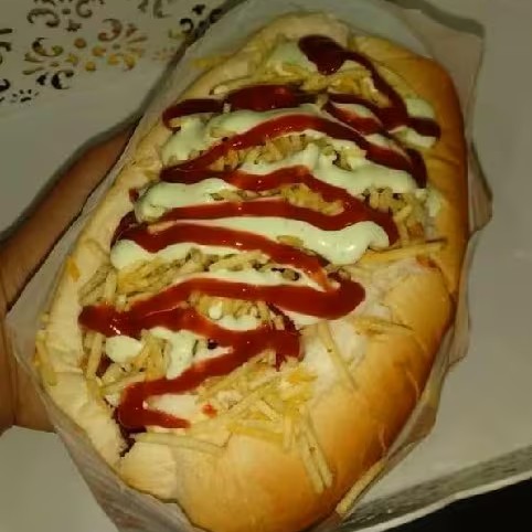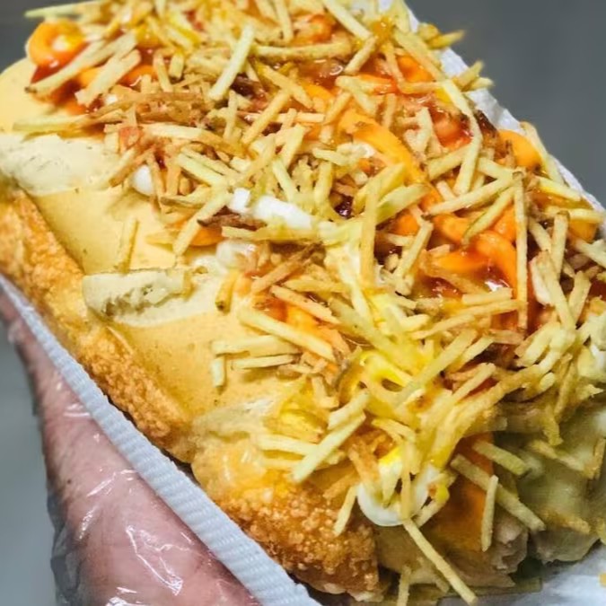 Hot Dog Completão: Pão, Salsicha, Milho, Vinagrete, Pure, Batata Palha Ketchup, Maionese, Frango, Calabresa, Bacon e Requeijão!