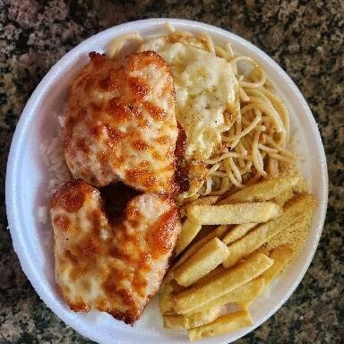Marmita: Arroz, Feijão, Macarrão, Batata Frita, Peixe a Parmegiana e Farofa