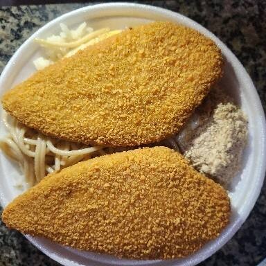 Marmita, Arroz, Feijão, Macarrão, Isca de Peixe Empanado, Batata Frita e Farofa,