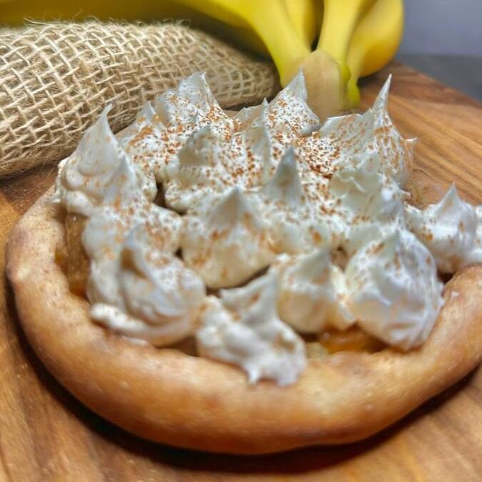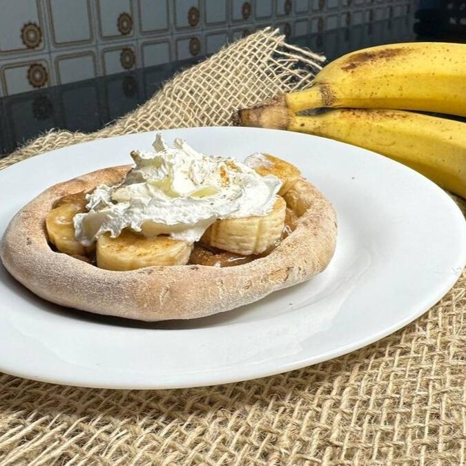 Base de banana caramelizada com doce de leite coberto por uma nuvem de chantily e canela.