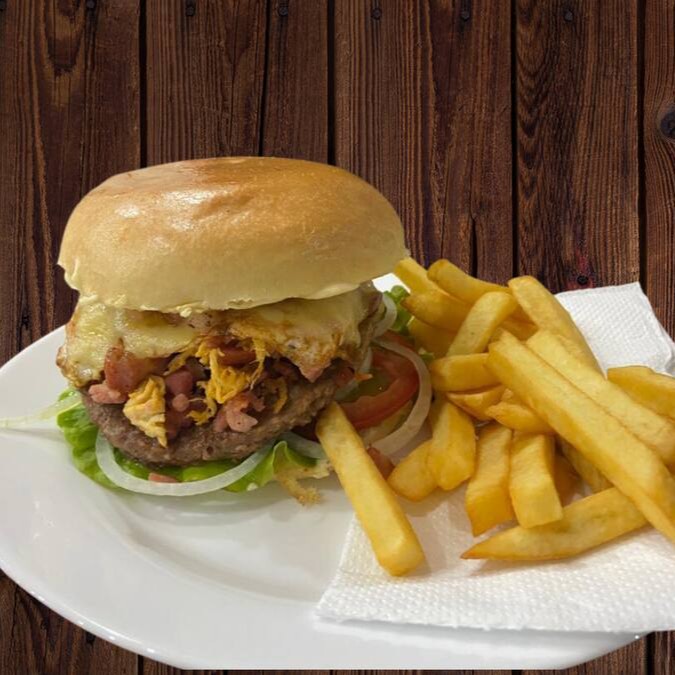Pão de Brioche, molho da casa, hambúrguer artesanal de 90 g, queijo, frango desfiado, calabresa, ovo, bacon, cebola e salada !