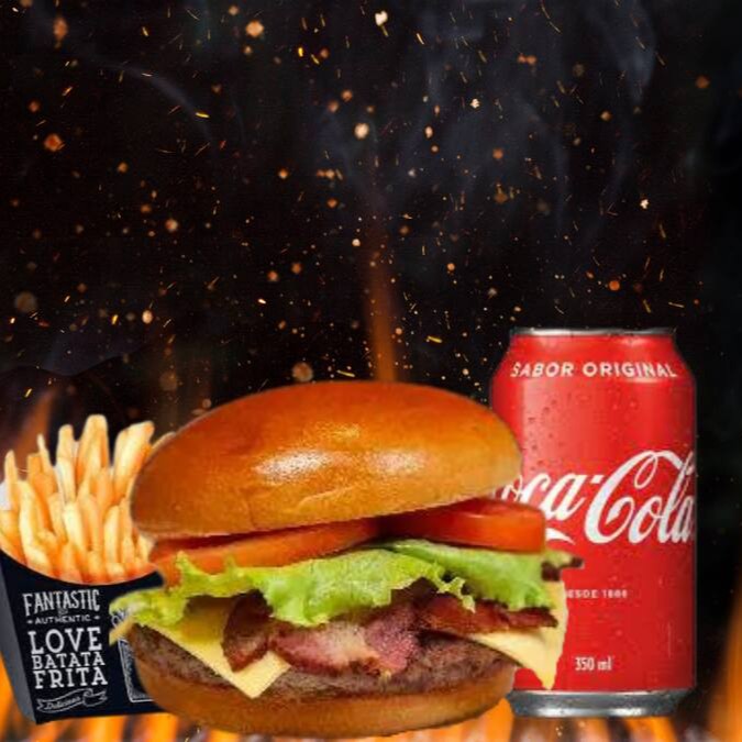Pão de Brioche, molho, hambúguer artesanal, bacon, mussarela, anéis de Cebola empanada, Ovo frito e salada+ refri lata + Porção Individual de Fritas.
