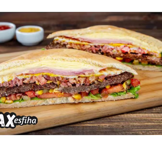 Um caprichado pão artesanal com molho, hambúrguer picado, bacon, queijo, ovo, ervilha, milho, presunto e salada
