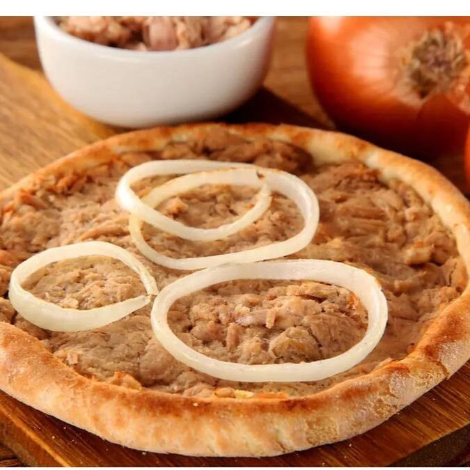 Pizza de 8 pedaços, com base de molho de tomate caseiro, atum desfiado coberto com requeijão cremoso, cebolas e azeitonas