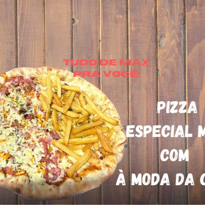 Pizza super recheada metade especial Max: mussarela, batata frita, bacon, Catupiry e a outra metade à moda da casa: mussarela, calabresa fatiada, presunto, frango desfiado, Catupiry, cebola, bacon e azeitonas.