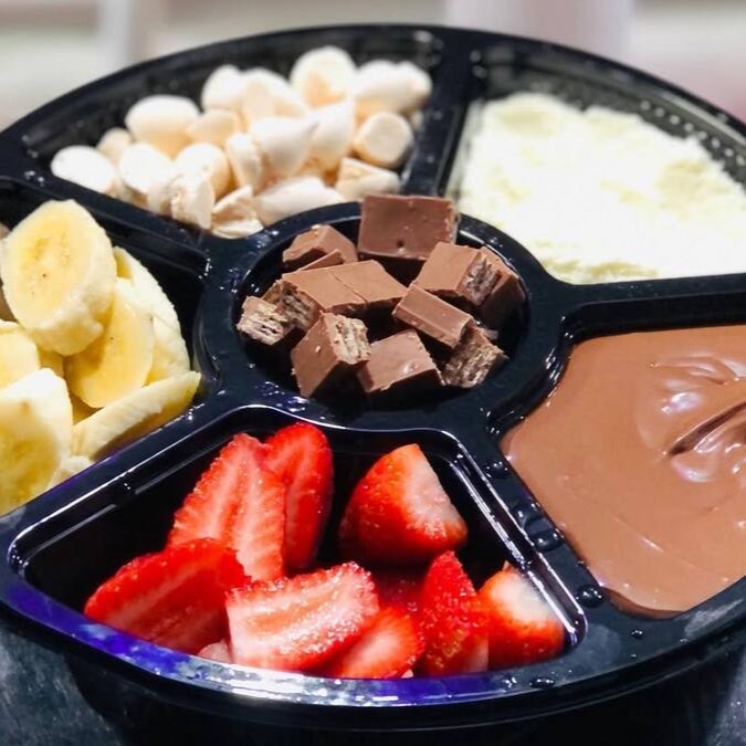 Fondue completo com nossas frutas frescas , acompanha delicioso chocolate trufado , perfeito para uma sobremesa apos uma refeição e para o friozinho , serve bem 1 pessoa .