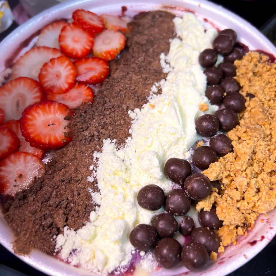 Açaí no Copo montado no copo térmico de 700ml com 7 acompanhamentos grátis (para manter aquela qualidade irresistível) com 3 camadas de complementos, sendo 1 na base do copo, 1 no meio do copo e 1 no topo do copo. - Se desejar colher, por favor, adicionar isso na observação ou nas perguntas logo a baixo.