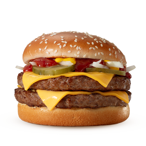 Dois hambúrgueres (100% carne bovina), mostarda, ketchup, cebola, queijo cheddar e pão com gergelim.