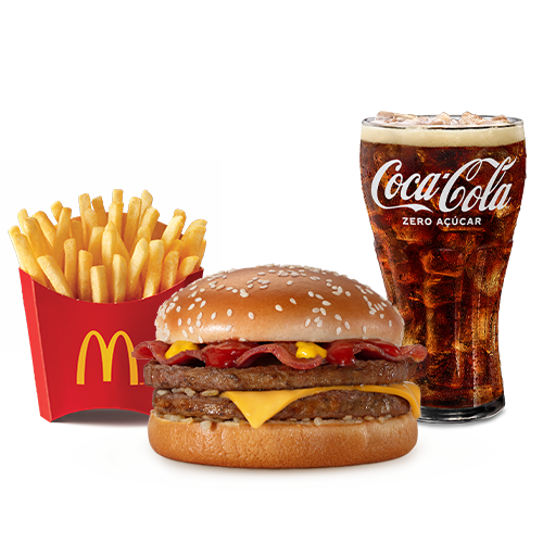 Dois hambúrgueres (100% carne bovina), queijo cheddar, cebola, fatias de bacon, ketchup, mostarda e pão com gergelim, acompanhamento e bebida.