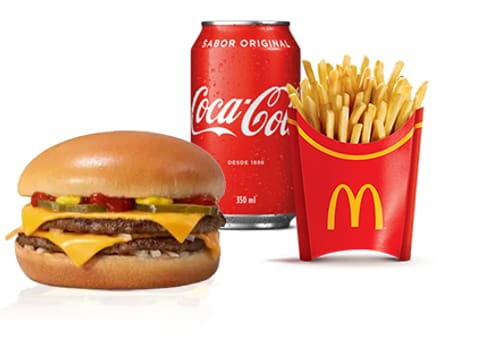 Um hamburguer (100% carne bovina), queijo procesado sabor cheddar, cebola, picles, ketchup, mostarda e pão sem gergelim, acompanhamento e bebida.