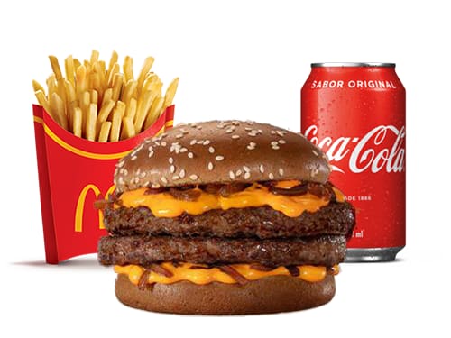 Dois hambúrgueres (100% carne bovina), molho lácteo com queijo tipo cheddar, cebola ao molho shoyu e pão escuro com gergelim, acompanhamento e bebida