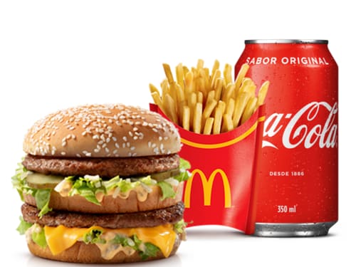 Dois hambúrgueres (100% carne bovina), alface americana, queijo cheddar, maionese Big Mac, cebola, picles e pão com gergelim, com batata e bebida