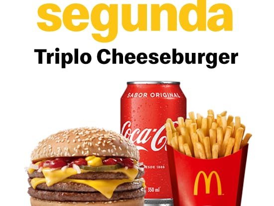Três hambúrgueres (carne 100% bovina), queijo processado sabor cheddar, cebola, picles, ketchup, mostarda e pão com gergelim; com acompanhamento e bebida.