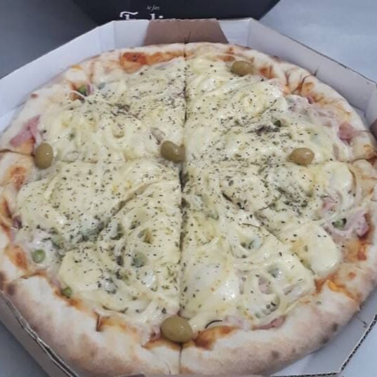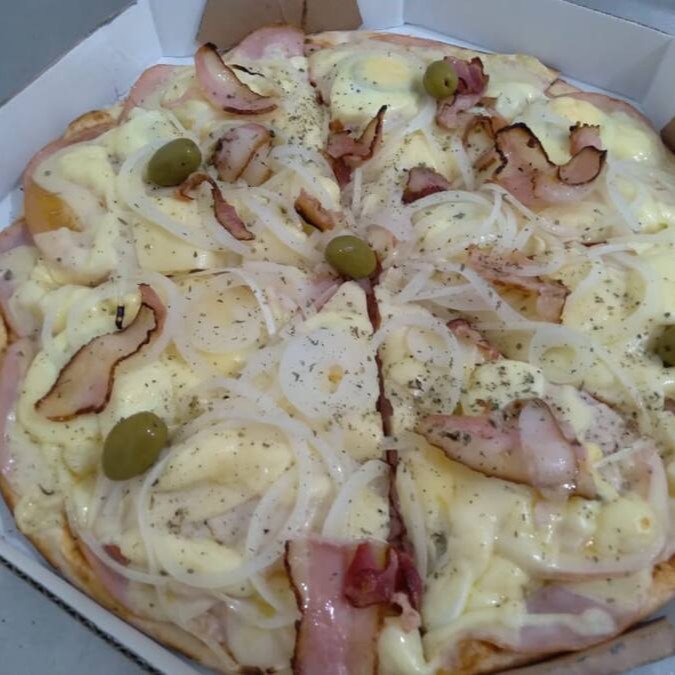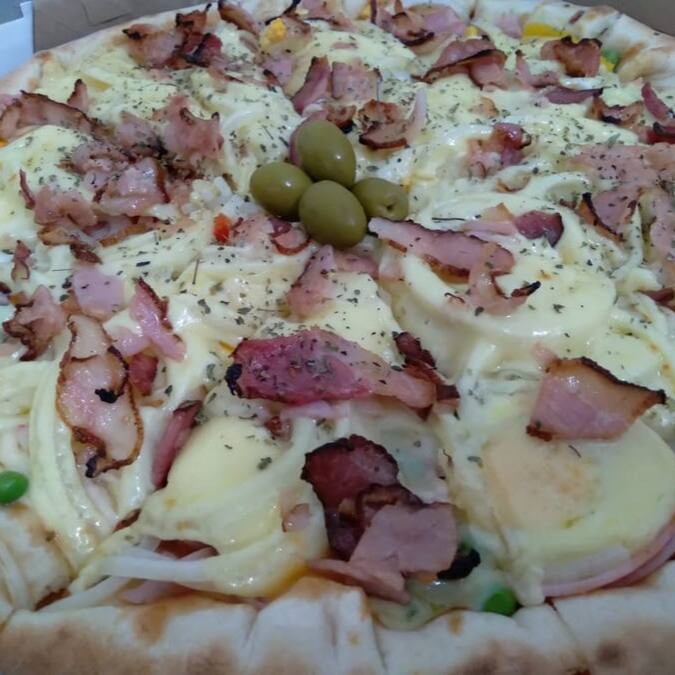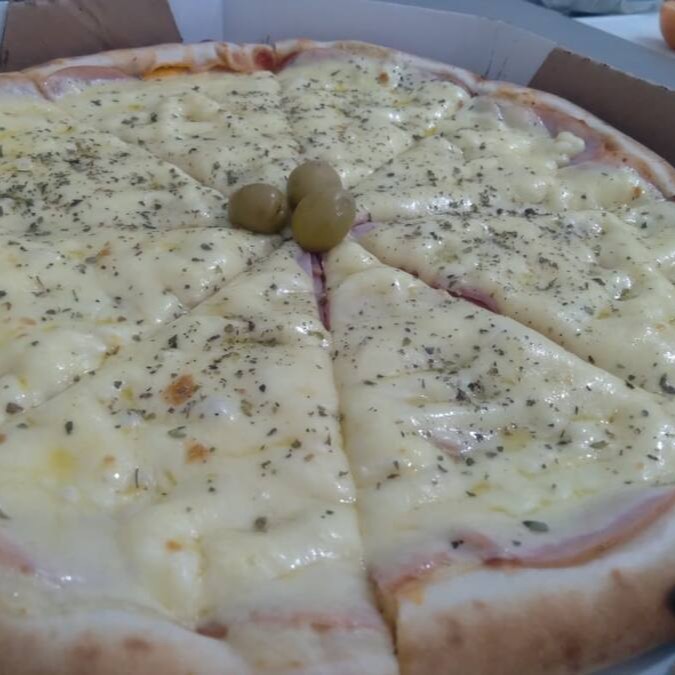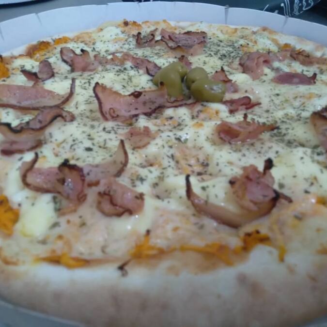 Frango, catupiry, mussarela, bacon, azeitonas e óregano