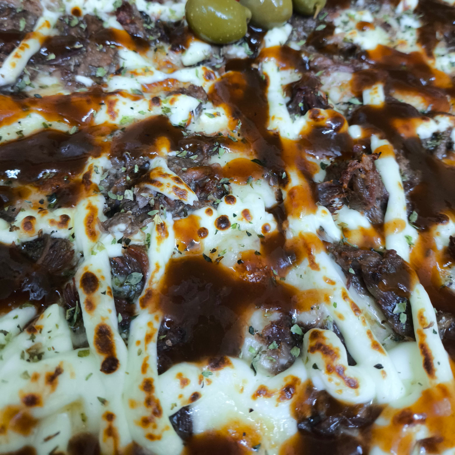 Mussarela, costela desfiada, catupiry, molho BBQ, azeitonas e óregano