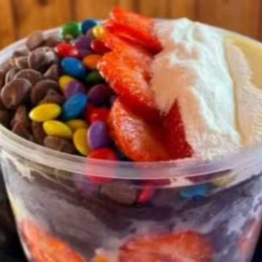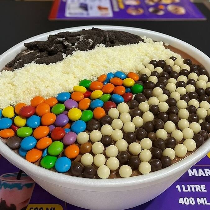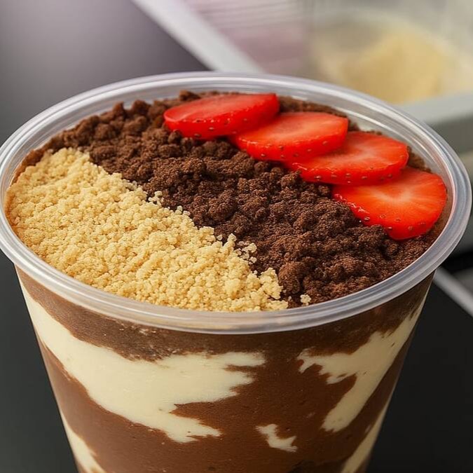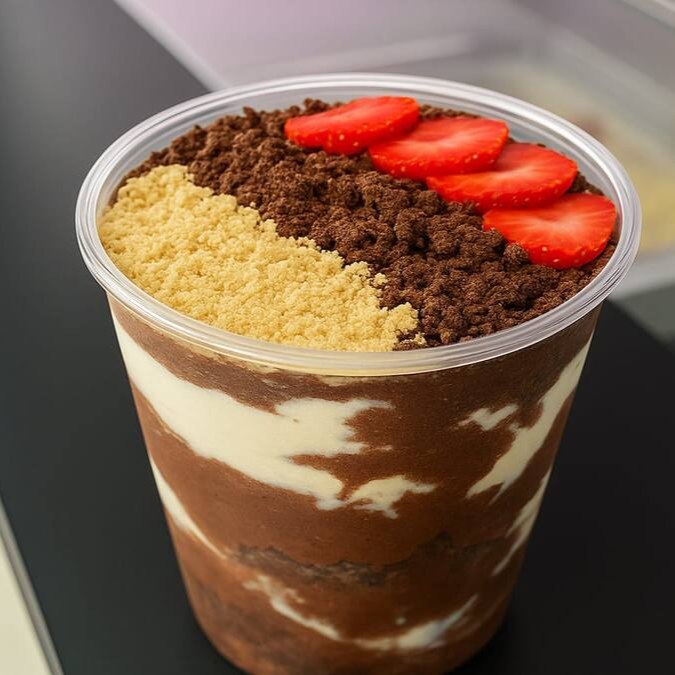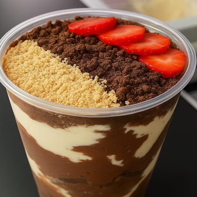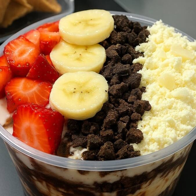 Uma explosão de sabores em cada colherada! Creme de Ovomaltine, cookies leite condensado, e leite em pó e você pode escolher uma fruta da sua preferencia que criam uma delícia irresistível."