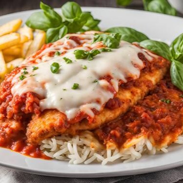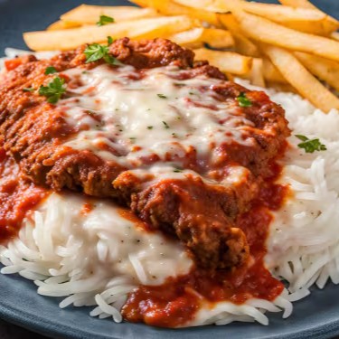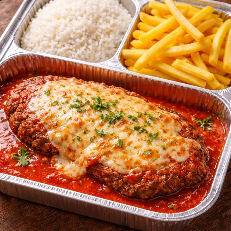 Um suculento corte de alcatra empanado e frito, coberto com um molho de tomate caseiro e uma camada generosa de queijo derretido. Servido com arroz e batatas fritas, esse prato combina sabor e conforto, perfeito para qualquer ocasião. Uma verdadeira celebração da culinária! Buon Appetito!