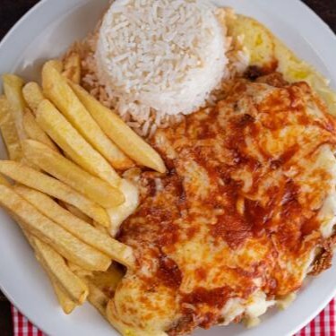 Suculento filé de alcatra empanado, coberto com molho de tomate caseiro e queijo derretido, servido com arroz e fritas crocantes + Refrigerante Lata.
