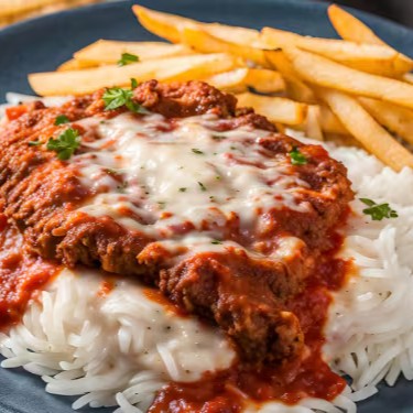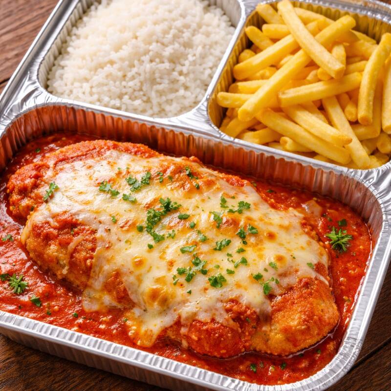 Suculento filé de frango empanado, coberto com molho de tomate caseiro e queijo derretido, servido com arroz e fritas crocantes. Uma explosão de sabores que vai conquistar você! Buon appetito!