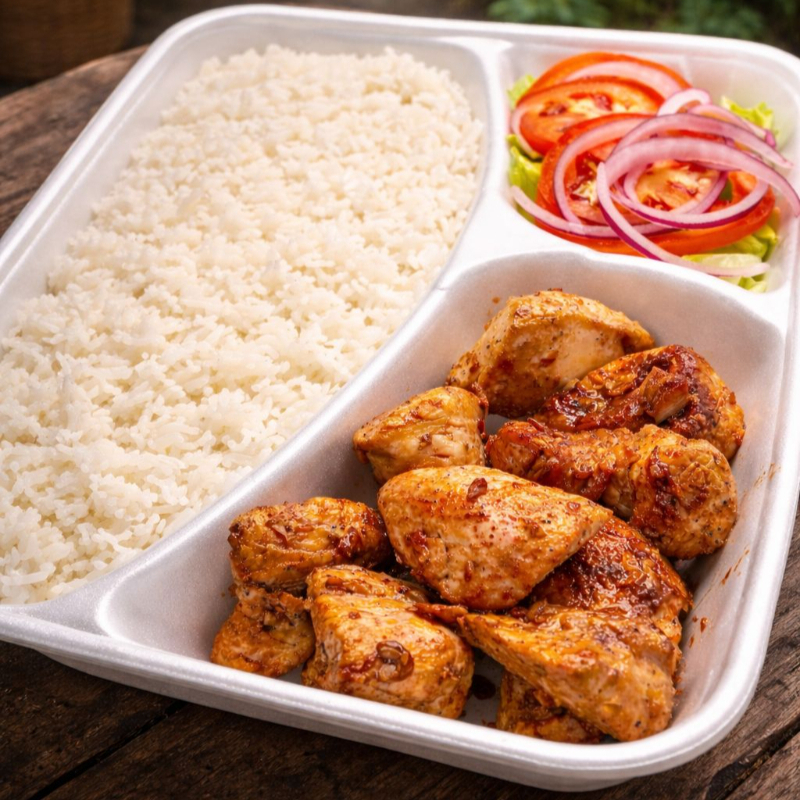 Frango grelhado em cubos, acompanhado de arroz, feijão e saladinha.