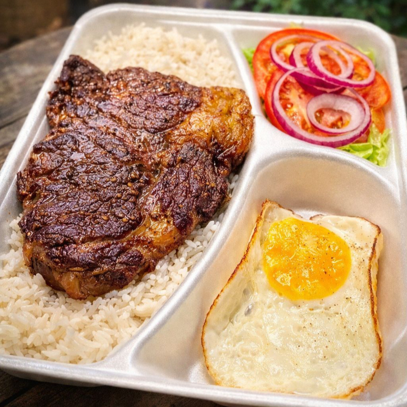Um delicioso bife de contra filé, acompanhado de arroz, feijão, ovo frito e saladinha.