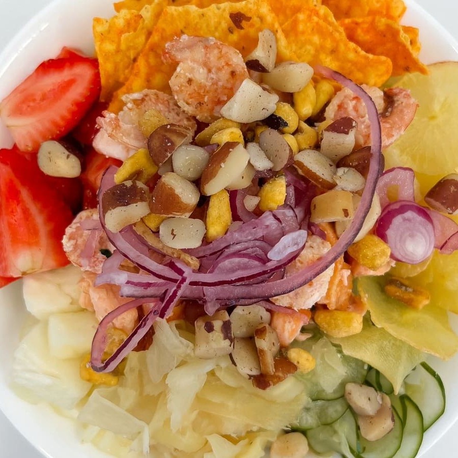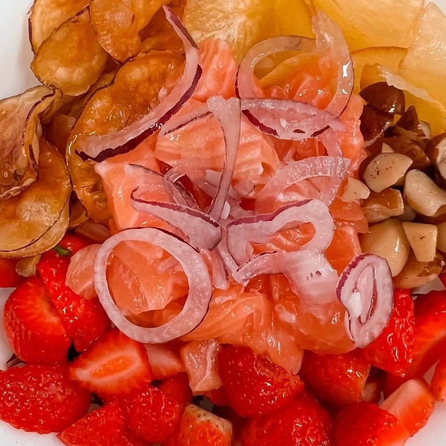 Salmão, Arroz Gohan, Repolho Roxo, Morango, Chips de Batata Doce, Chips de Mandioca, Castanha do Pará, Molho Tarê, Azeite Trufado, Cebola Roxa e Gergelim.