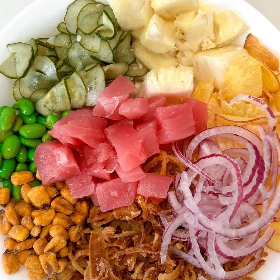 Atum, Arroz Gohan, Espaguete de Pupunha, Sunomono, Abacaxi, Edamame, Chips de Mandioca, Cebola Crispy, Milho Crunch, Shoyo, Cebola Roxa, Cebolinha e Gergilim.