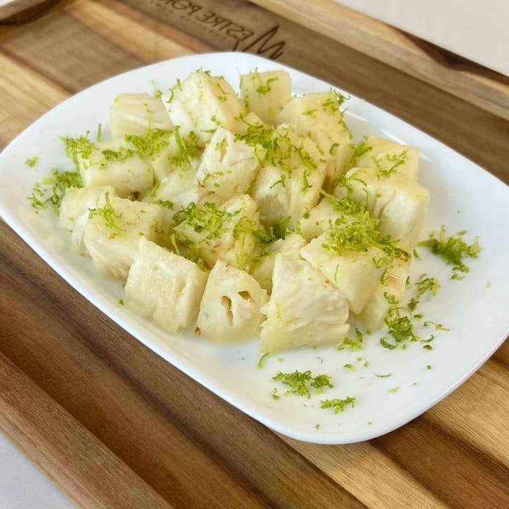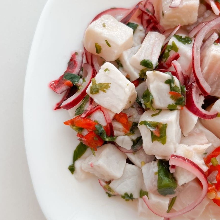 Ceviche Havaiano, Espaguete de Abobrinha, Mix de Folhas, Sunomono, Manga, Abacate, Tomate cereja, Chips de Mandioca, Amêndoas Laminadas, Molho Ponzu, Cebola Roxa e Pimenta Biquinho.