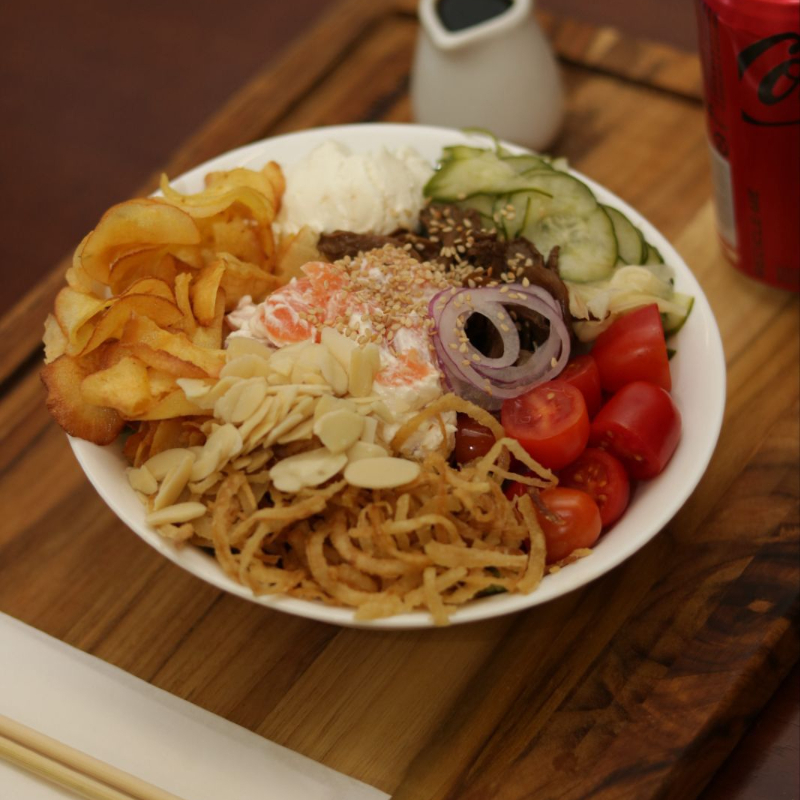 Salmão com Cream Cheese, Shimeji, Arroz Gohan, Mix de Folhas, Sunomono, Tomate Cereja, Cream Cheese, Chips de Mandioca, Cebola Crispy, Amêndoas Laminadas, Molho Tarê, Gengibre, Cebola Roxa e Gergilim.