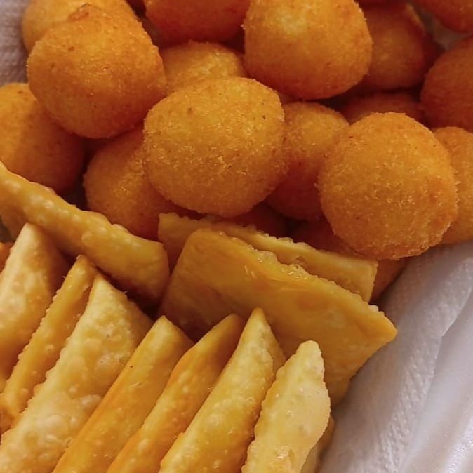 Serve de 2 a 4 pessoas. Monte sua Caixa Bruta, com uma porção de 50 mini salgados, e 50 pastéis. Fritos na hora. Uma verdadeira delícia.