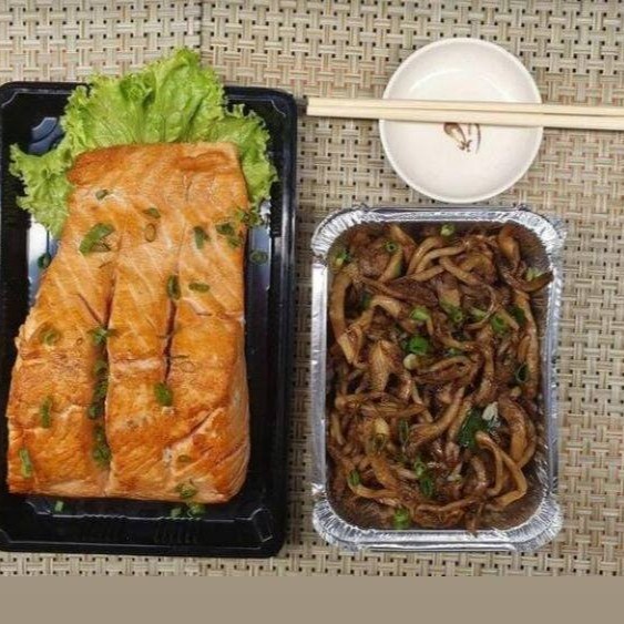 Porçao de shimeji e salmão grelhado.