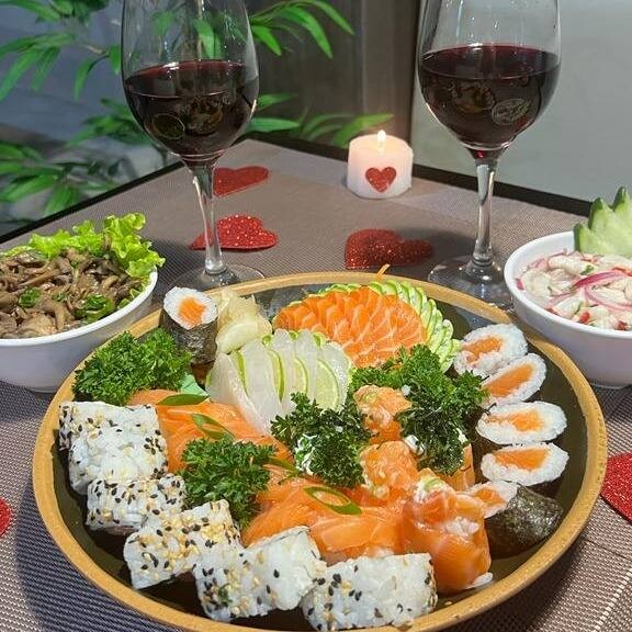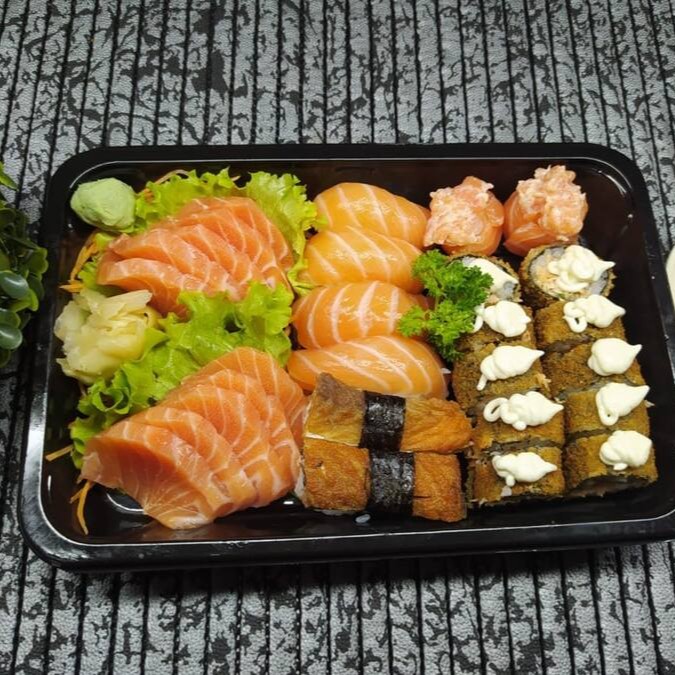 10 sashimis, 4 niguiri de salmão, 2 niguiri skin, 2 luizinho de salmão, 10 hot roll.