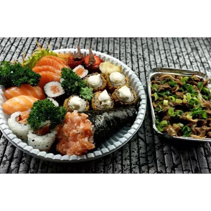 1 temaki sem arroz, 10 sashimis, 5 luizinho sem arroz, 1 shimeji, 1 sunomono
