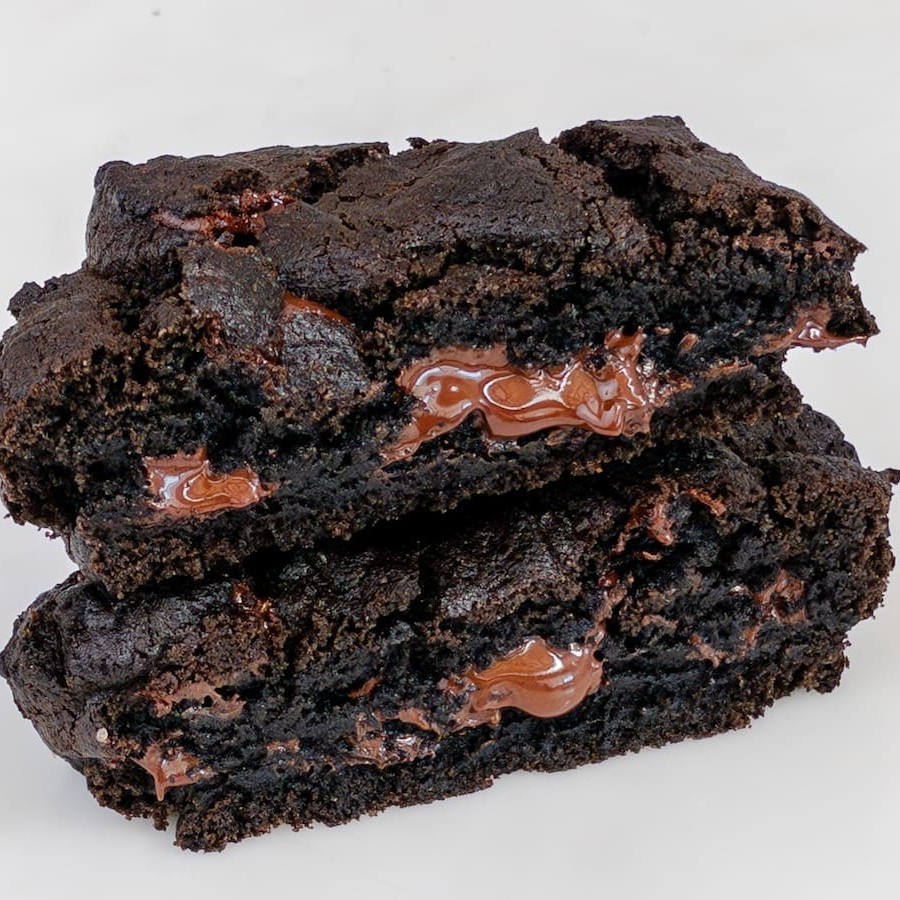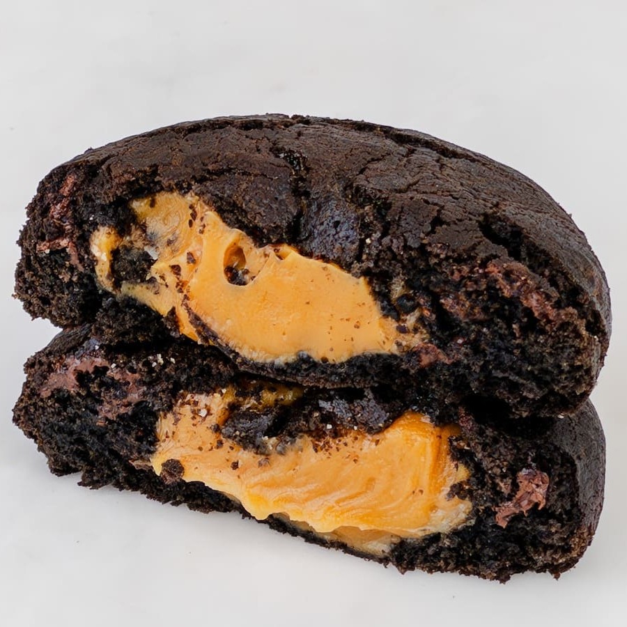 Cookie de massa de chocolate recheado com doce de leite cremoso.