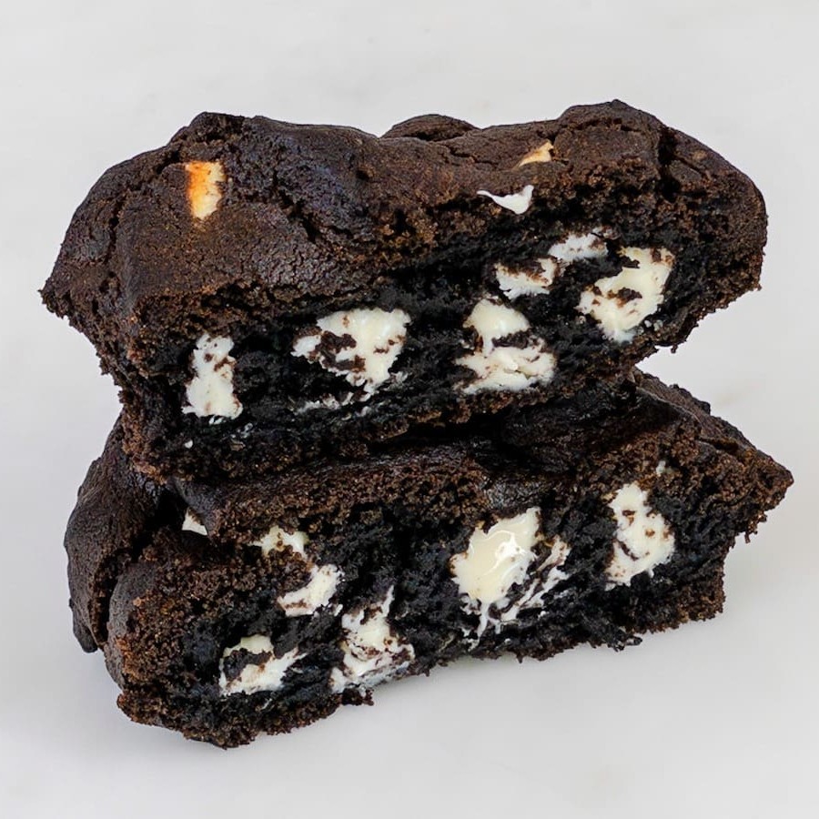 Cookie tradicional, recheado com cookie chocolate e chocolate branco.