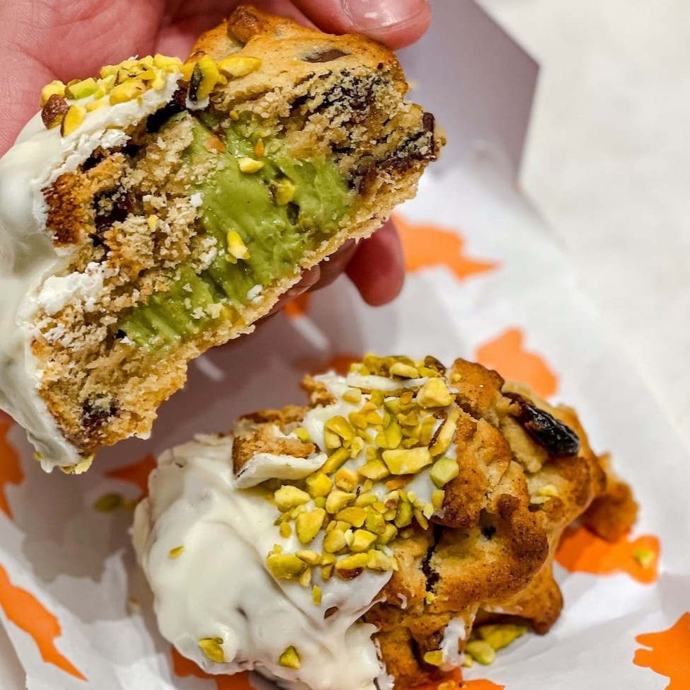 Cookie tradicional recheado com creme de pistache puro, finalizado com chocolate branco e pistache granulado.