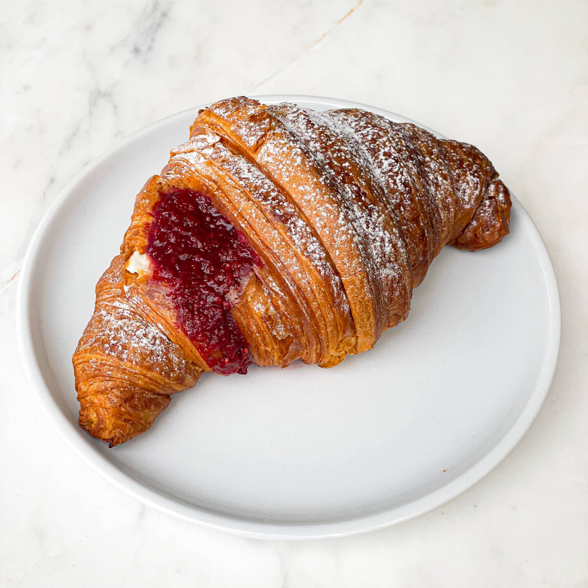 Croissant clássico francês recheado com creme de cream cheese e geleia de framboesa finalizado com açúcar confeiteiro.