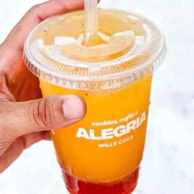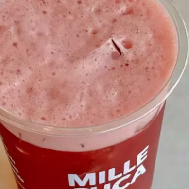 Calda de morango, água gaseificada, suco de laranja e gelo.