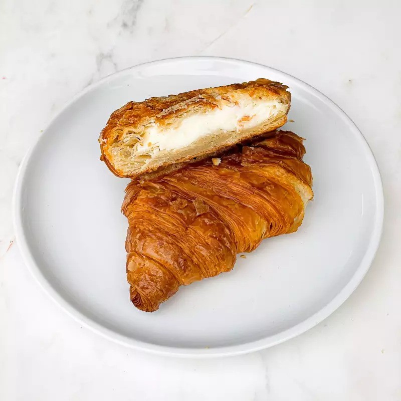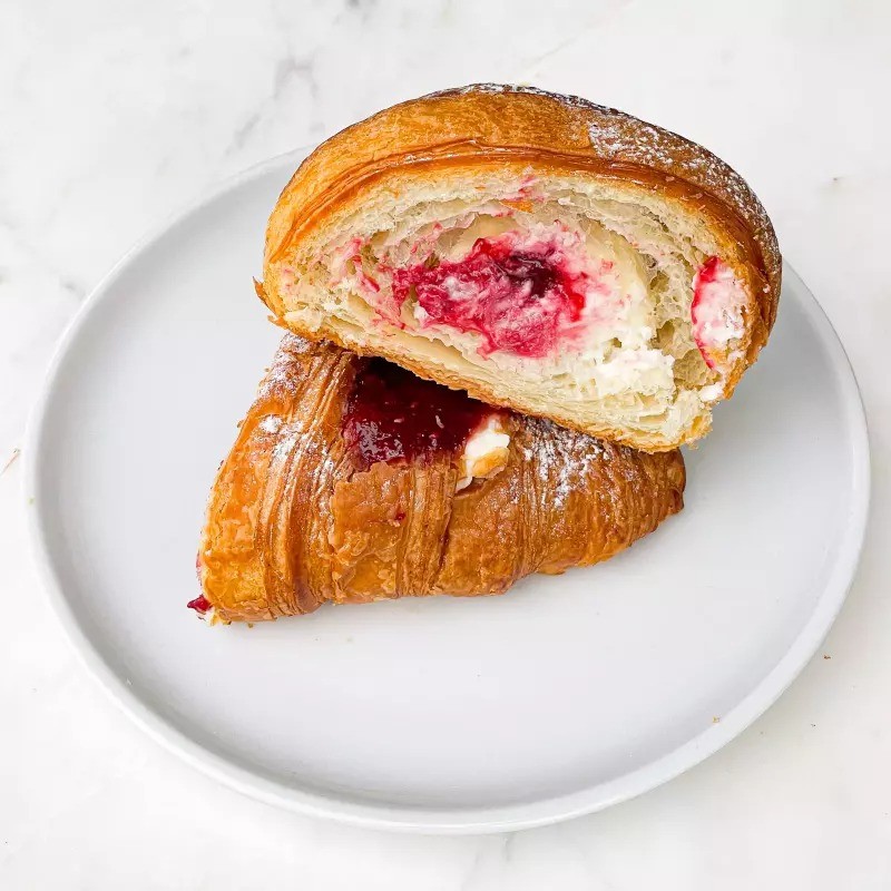 Croissant recheado com creme de cream cheese e geleia framboesa.