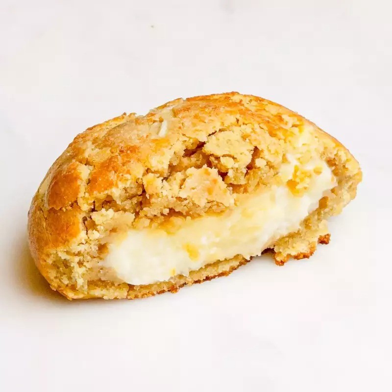 Cookie baunilha com gotas de chocolate branco e coco ralado, recheado com cocada de maracujá e finalizado com crumble