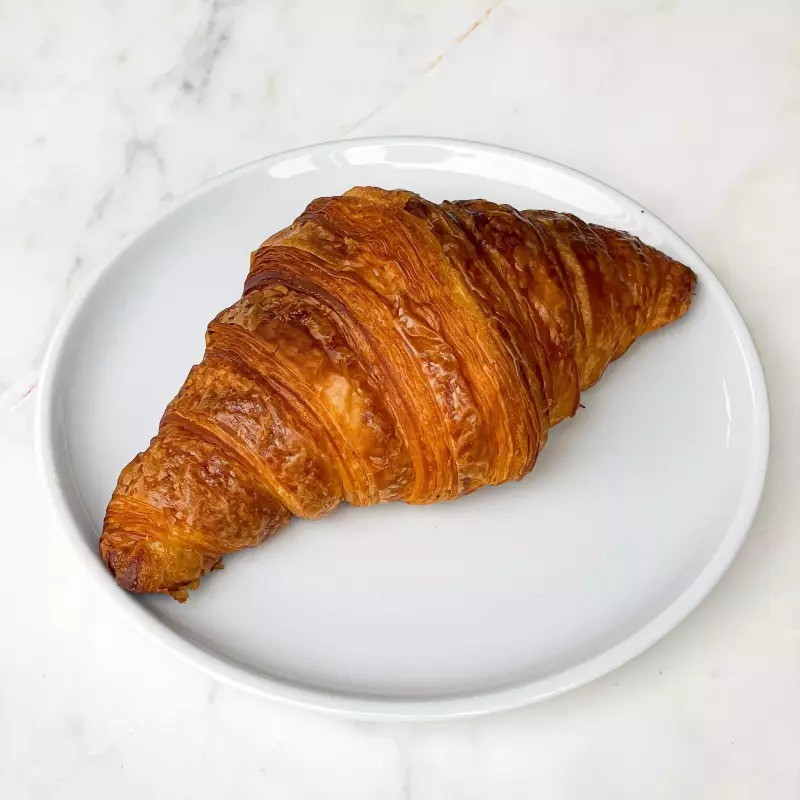 O Croissant Clássico, feito artesanalmente com pura manteiga, camadas de auvelos macias e de textura levemente crocante.