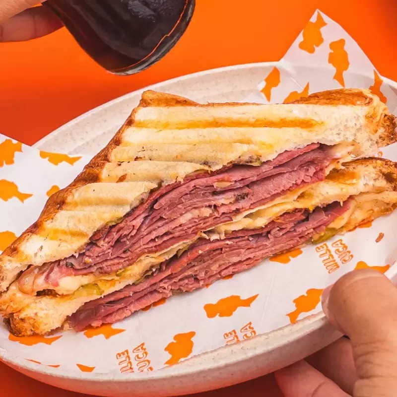 Brioche com pastrami defumado e fatiado, pepino em conserva, mussarela fior di latte e molho barbecue.