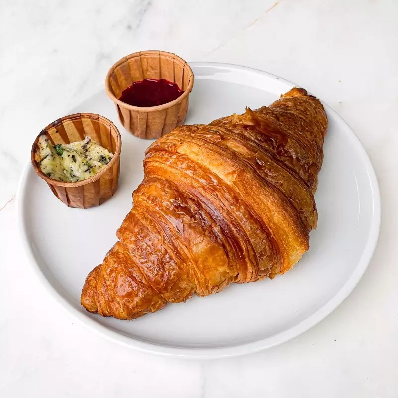 Croissant servido com manteiga e geleia sazonal.