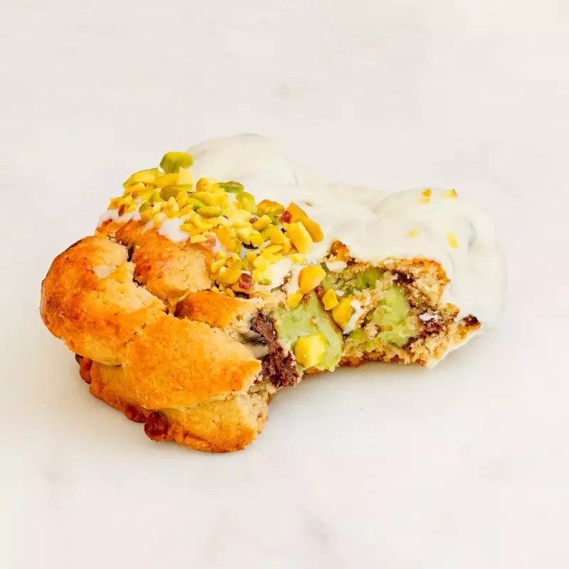 Cookie tradicional recheado com creme de pistache puro e finalizado com chocolate branco e pistache granulado.