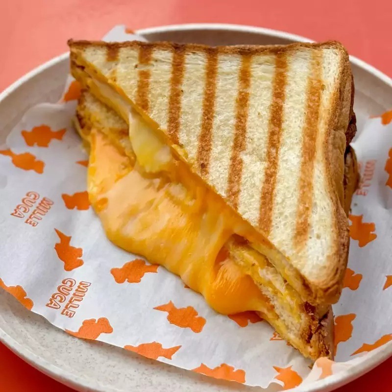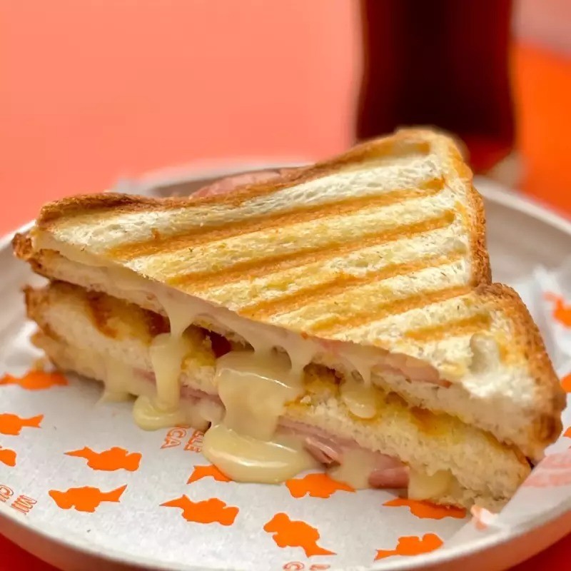 Brioche com queijo cheddar, mussarela fior di latte e cream cheese selado com manteiga e finalizado no grill.