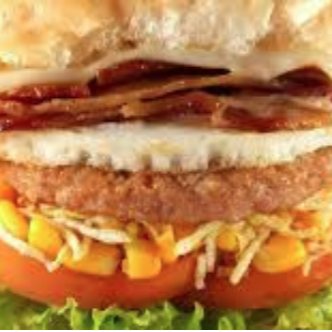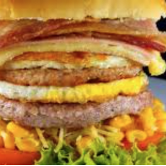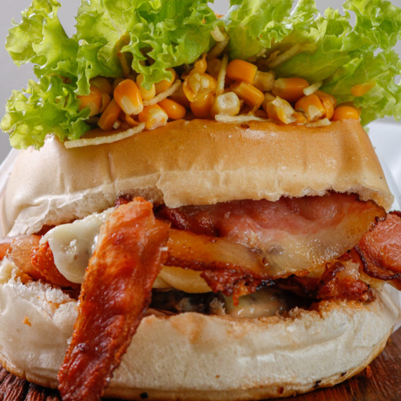 Suculento Hambúrguer caseiro, ovo, tiras de bacon, presunto, muçarela, alface, tomate, milho, batata palha caseira, molho secreto e maionese.