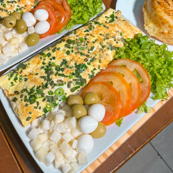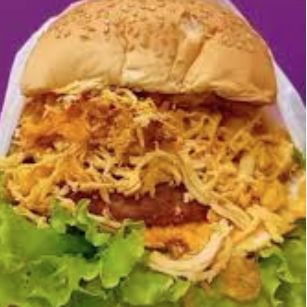 Suculento Hambúrguer caseiro, frango desfiado da casa, ovo, presunto, muçarela, alface, tomate, milho, batata palha caseira, molho secreto e maionese.