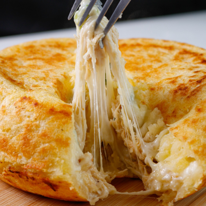 Frango, Requeijão cremoso, mozarela, molho secreto, cheiro verde (cebolinha).