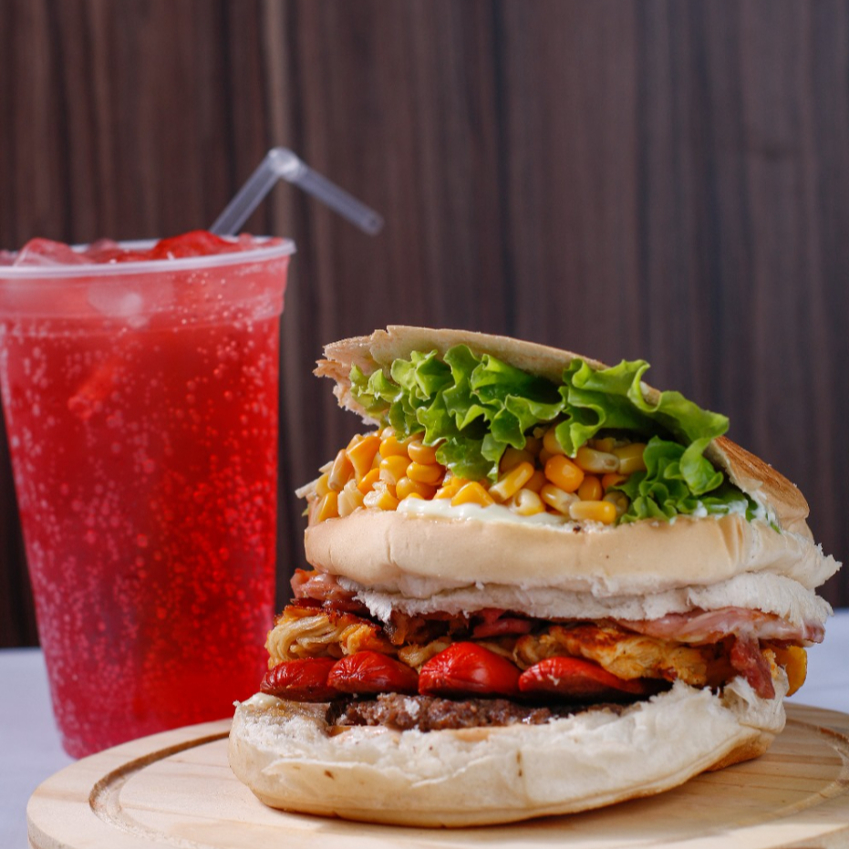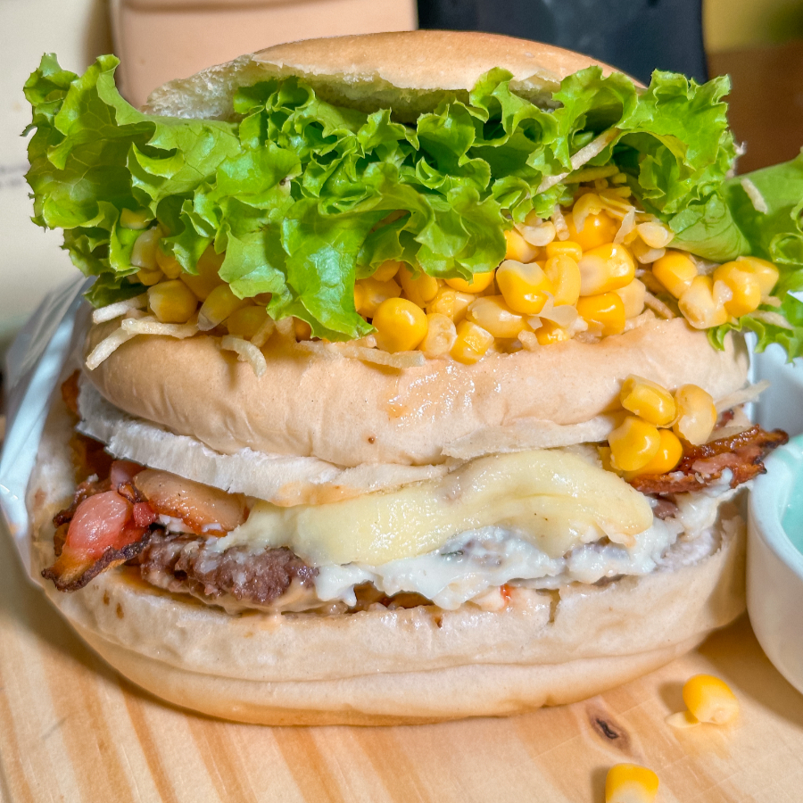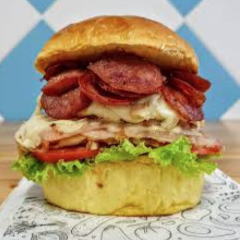 Suculento Hambúrguer caseiro, calabresa defumada, presunto, muçarela, alface, tomate, milho, batata palha caseira, molho secreto e maionese.